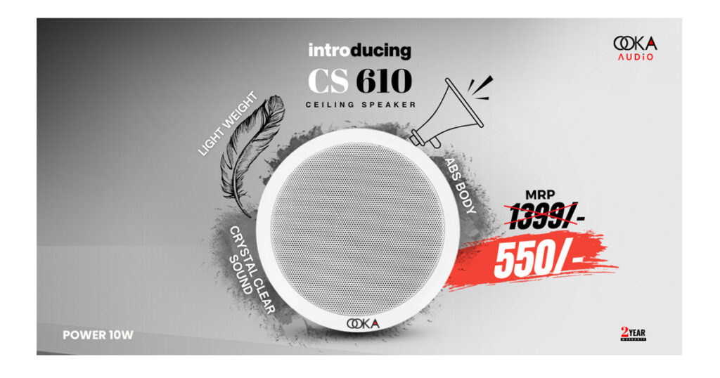 India’s most prominent Next Gen Audio System provider, Ooka Audio, has just dropped the All-New Bharat-made 10W Ceiling Speaker 610 — a lightweight ABS ceiling Speaker with powerful sound! It’s a sweet mix of minimalism, power, clarity, and it looks awesome built into any ceiling. The CS 610 makes every little sound pop, turning your place into a smooth sound zone. Plus, it’s easy to install and super dependable.